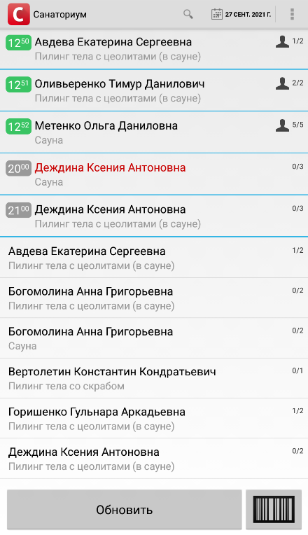 - Кнопка "Штрих-Код" - открывает окно сканирования (сотрудник сканирует данный код с расписания в приложении, сразу открывается необходимый пациент и услуга, которую необходимо отпустить).