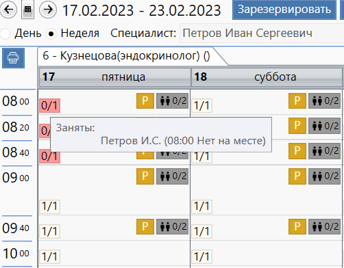 - Готово! В расписании кабинета/назначении отображается информация о том, что сотрудника нет на месте. И на это время записать пациентов нельзя.