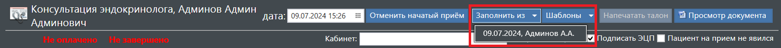 Добавлена возможность отменить начатый прием. Кнопка "Отменить начатый прием" активна, если в шаблоне консультаций не было добавлено никаких назначений и диагнозов.