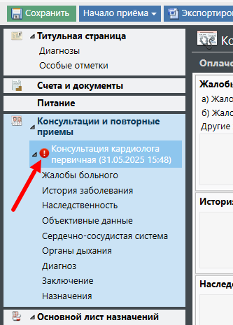Также в разделе «Консультации и повторные приемы» рядом с названием текущей консультации будет отображаться индикатор, предупреждающий о том, что СЭМД был отклонен: