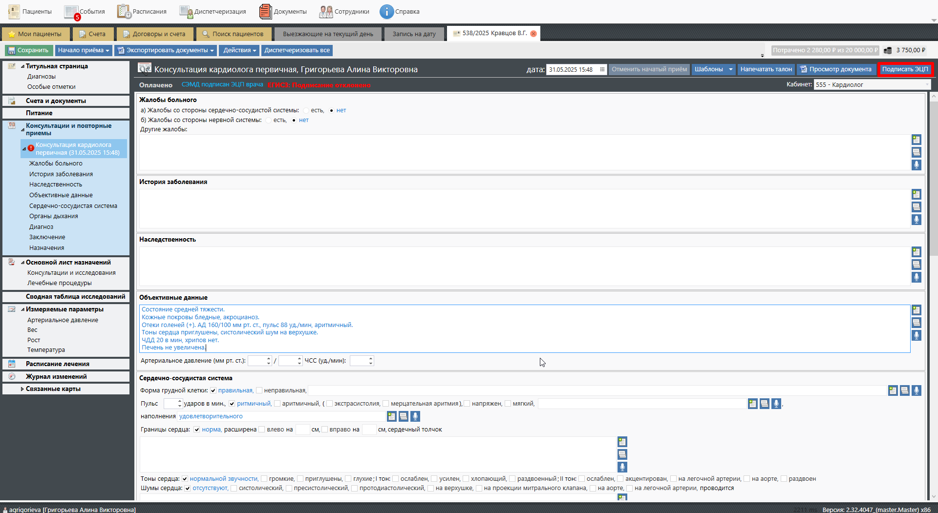 После подписания в шапке шаблона протокола изменится статус документа: «ЕГИСЗ: На утверждении». В разделе «Консультации и повторные приемы» рядом с названием консультации будет отображаться зеленая галочка, как при завершении приема: