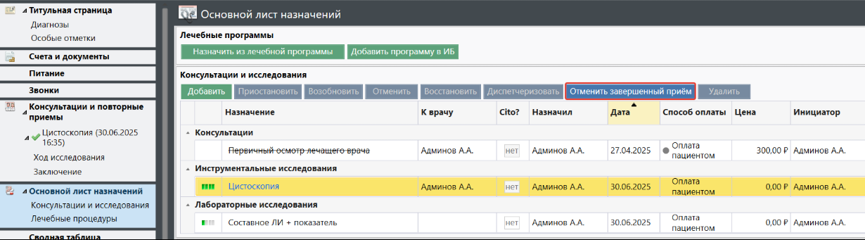 На основной лист назначений добавлена возможность отменить и восстановить завершенный прием: