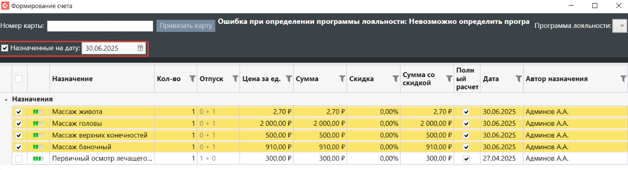 В окно формирования счета добавлен чек бокс "Назначенные на дату". По нажатию на галку в календаре проставляется текущее число и в таблице выбираются соответствующие услуги с их кол-вами (только не оплаченные диспетчеризированные назначения).