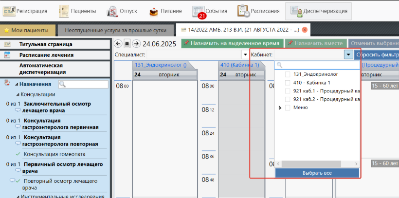 Для ускорения поиска кабинета, в окно ручной диспетчеризации добавлен фильтр по кабинетам: