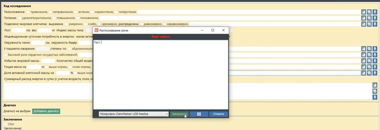 Врач нажимает в протоколе на кнопку записи аудио и начинает диктовать данные, которые должны быть записаны в текстовое поле. Во время диктовки сервис распознаёт речь говорящего и преобразует её в текст.