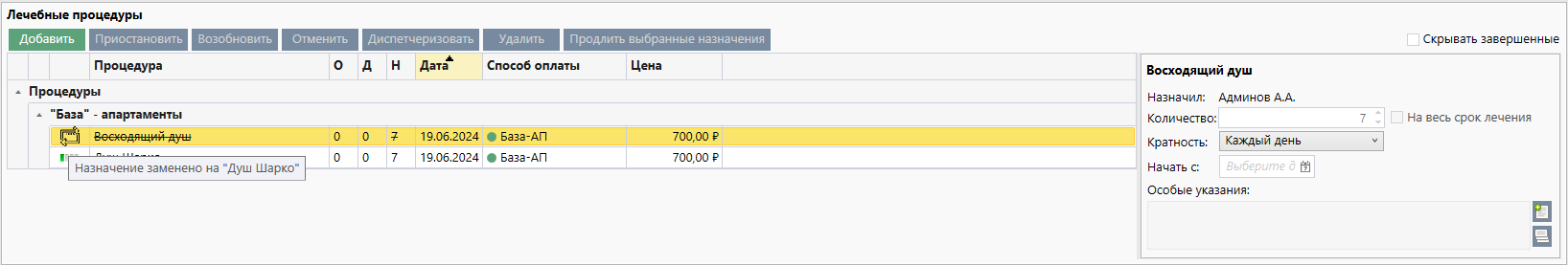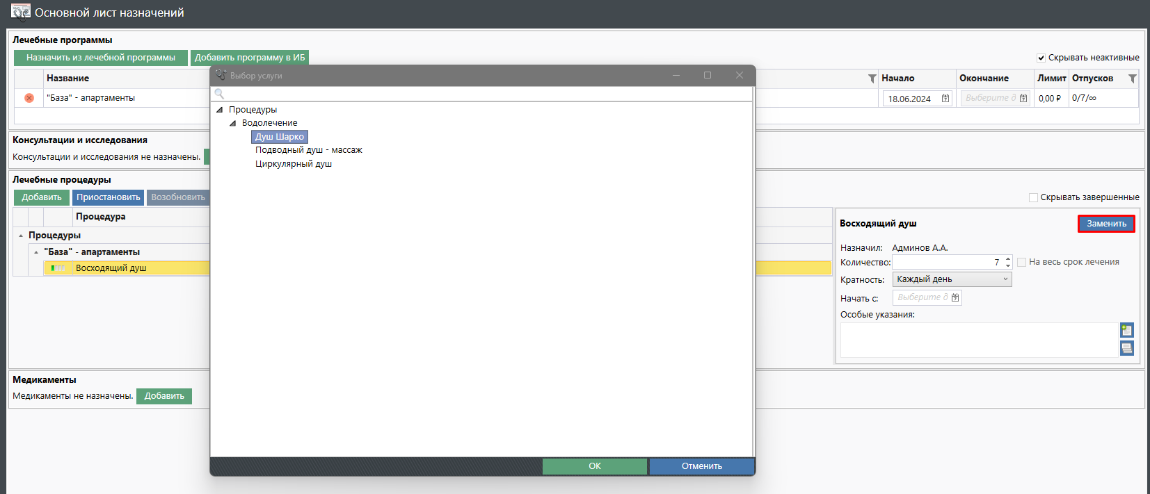 Добавлена возможность заранее определить для услуг из Лечебной программы список замен. Это ускоряет работу врача, когда пациент по каким-то причинам не может посещать определенные процедуры.