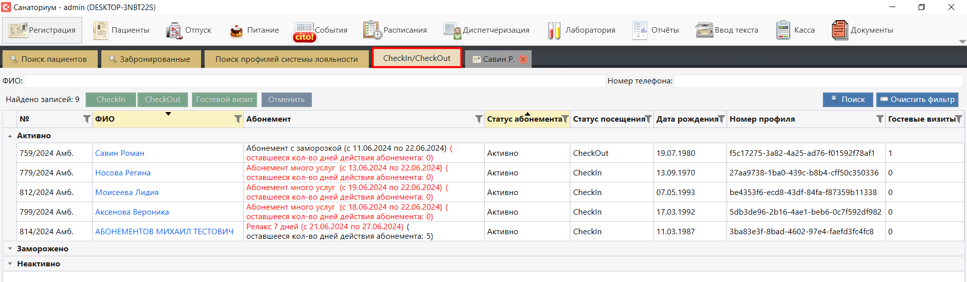 В модуле "Регистрация" добавлена вкладка "CheckIn/CheckOut" (доступна при наличии соответствующего права). Вкладка содержит: