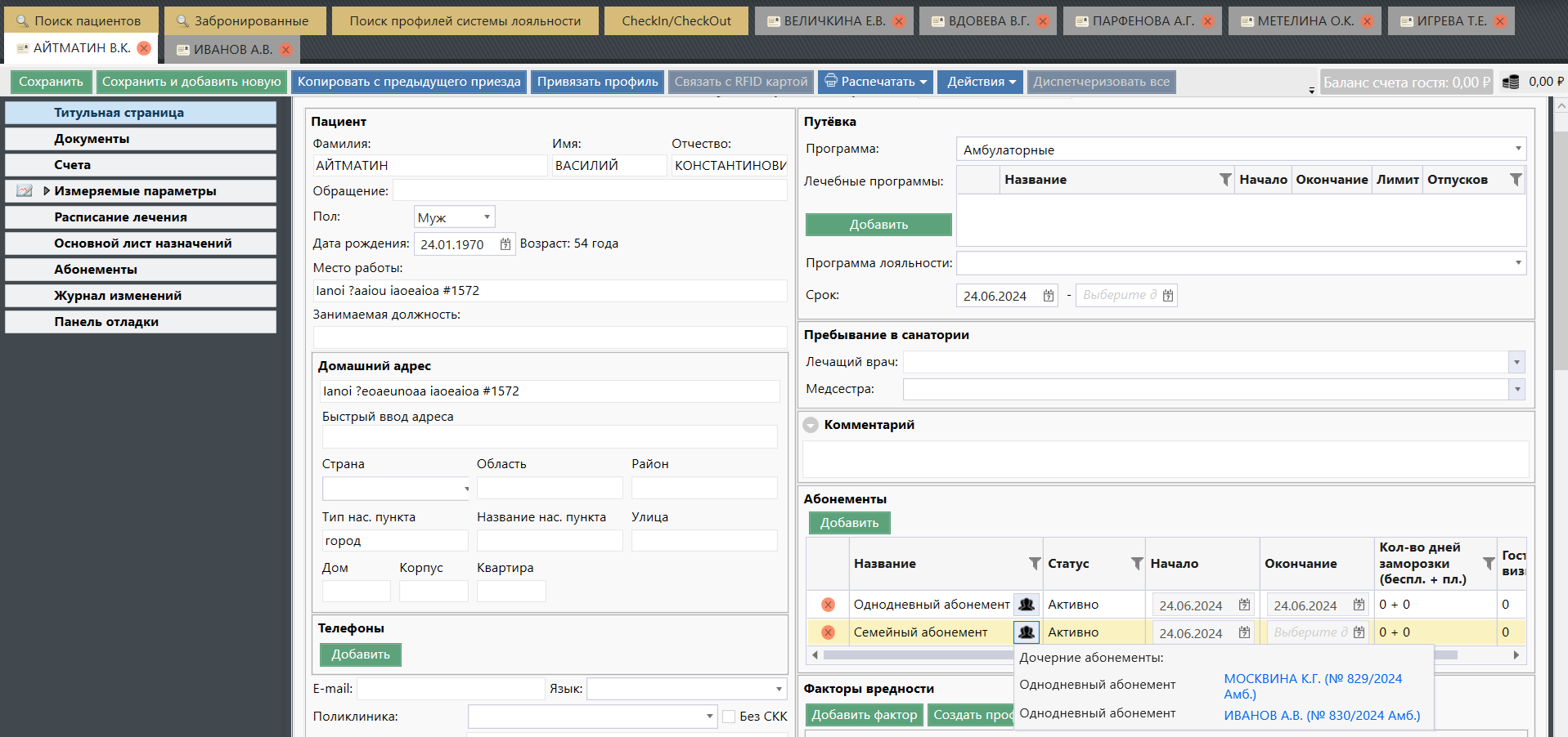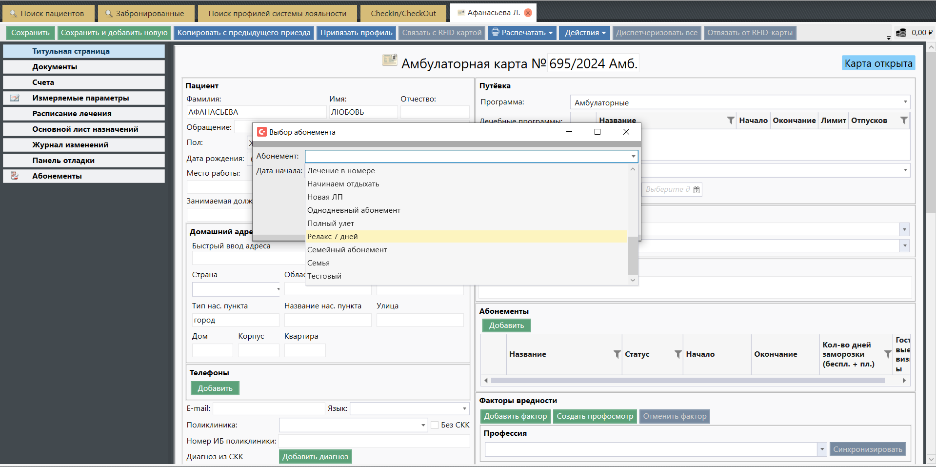 Абонемент - новый тип Лечебной программы для гостей, которые не планируют проживать на объекте, а хотят регулярно пользоваться услугами (тренажерный центр, водные процедуры, массаж и т.д.). Для таких гостей заводятся Амбулаторные карты.