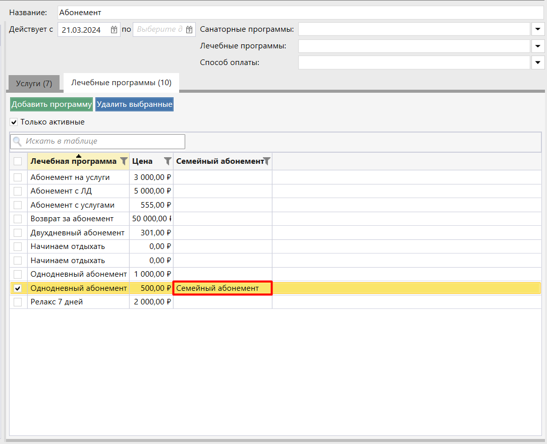 В справочнике "Лечебные программы" добавлен тип "Семейный абонемент" с возможностью включить в него дочерние абонементы (минимум 2). Один и тот же дочерний абонемент можно добавить несколько раз.