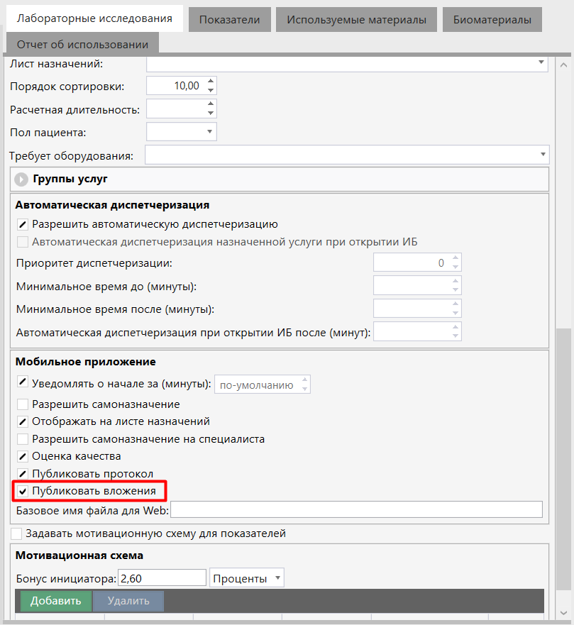В справочники Консультаций, Лабораторных и Инструментальных исследований добавлен параметр "Публиковать вложения" в раздел "Мобильное приложение". Параметр отвечает за публикацию документов, добавленных в рамках оказания услуги.