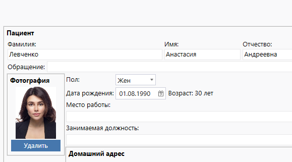 Обратите внимание на возможность автоматического заполнения секции "Домашний адрес". При заполнении поля "Быстрый ввод адреса" система Санаториум сама выделит из введенной строки нужные данные (например, город или номер дома) и вставит их в нужные поля.