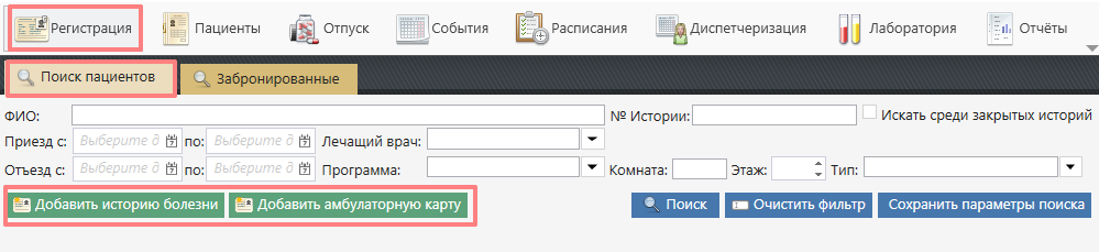 При отсутствии системы размещения для добавления новой ИБ или Амбулаторной карты необходимо нажать на кнопку "Добавить Историю болезни" или "Добавить амбулаторную карту" на вкладке "Поиск пациентов".