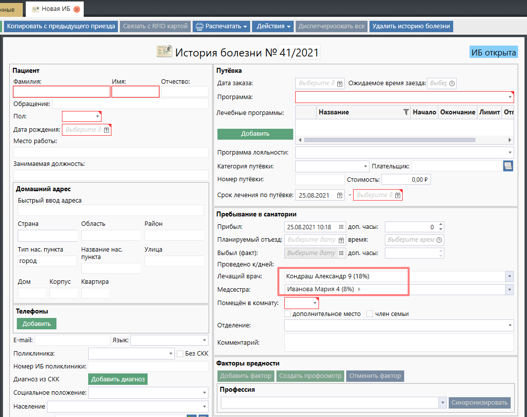 История болезни создается для клиента, который будет проживать в санатории. Если пациент приезжает повторно, то на каждый приезд заводят новую ИБ, связывая карты друг с другом.