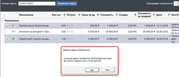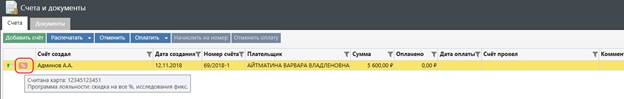 После нажатия кнопки «Да» система свяжет создаваемый счет с этой картой. После создания счета слева в таблице счетов показывается индикатор, что счет связан с картой лояльности. При наведении на иконку Вы можете ознакомиться с информацией о номере привязанной карты и её программе лояльности: