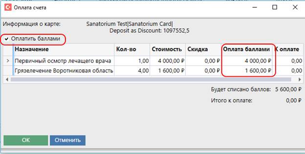 Для того, чтобы оплатить часть счета баллами, Вы должны включить переключатель "Оплатить баллами", в этом случае система отобразит сколько баллов будет списано по каждой позиции счета и сколько всего необходимо доплатить. Оставшуюся сумму гость доплачивает выбранным платежным инструментом.