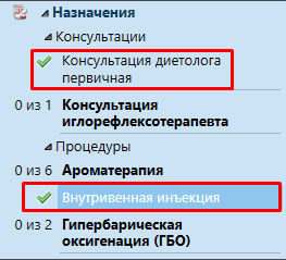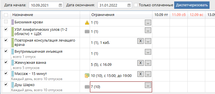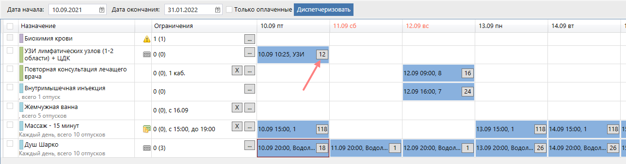 Таким образом назначения будут автоматически диспетчеризованы по правилам, присвоенным для каждого назначения отдельно, учитывая количество назначенных процедур и их кратность.