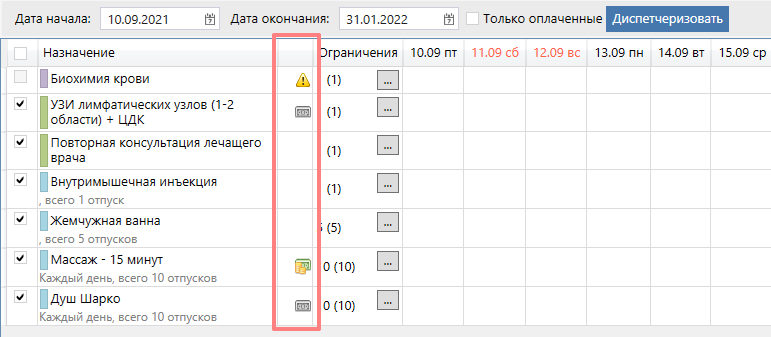 В столбце рядом с названием назначения выводятся значки оплаты и различных предупреждений. При наведении на значок будет выведена более подробная информация.