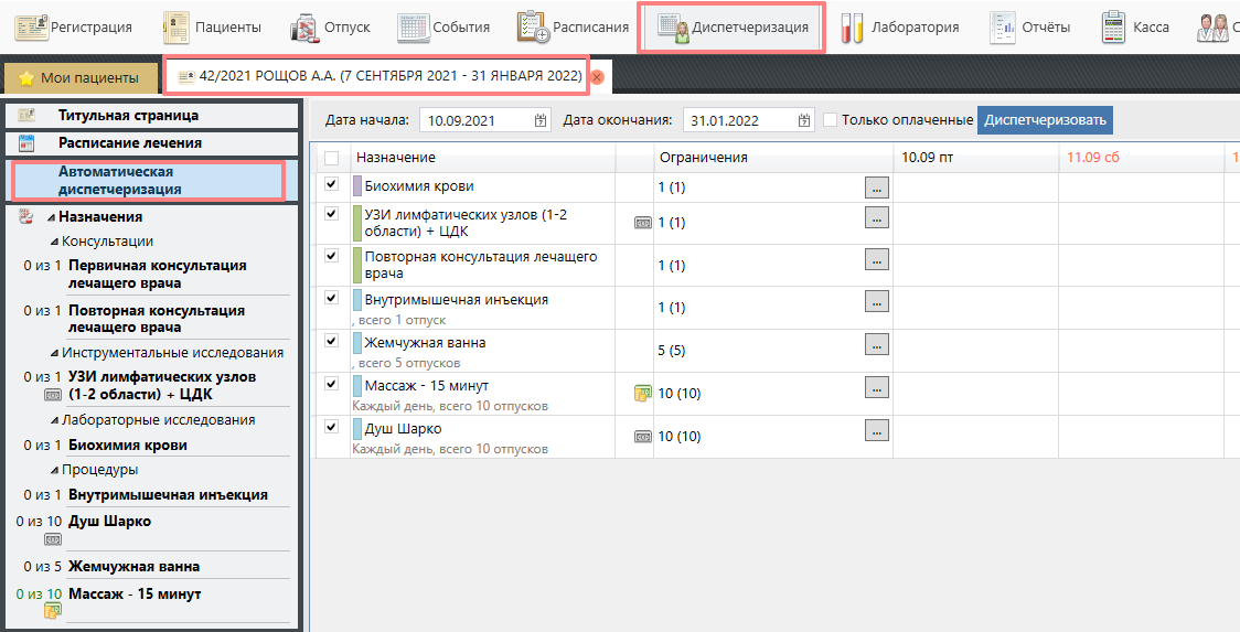 Модуль "Диспетчеризация" → выбираем необходимого пациента → секция "Автоматическая диспетчеризация" → открывается список назначений пациента, доступных для автоматической диспетчеризации.
