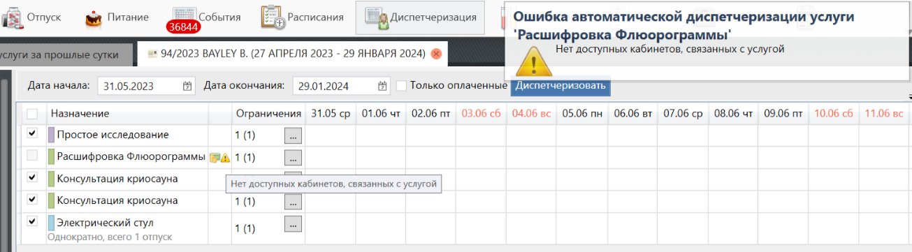 • Если занять время не удаётся т.к. на один из дней попадает нарушение правил (кабинет закрыт, идёт конфликт с другим назначением) - система занимает сколько сможет и предупреждает о том, что n процедур недиспетчеризовано.