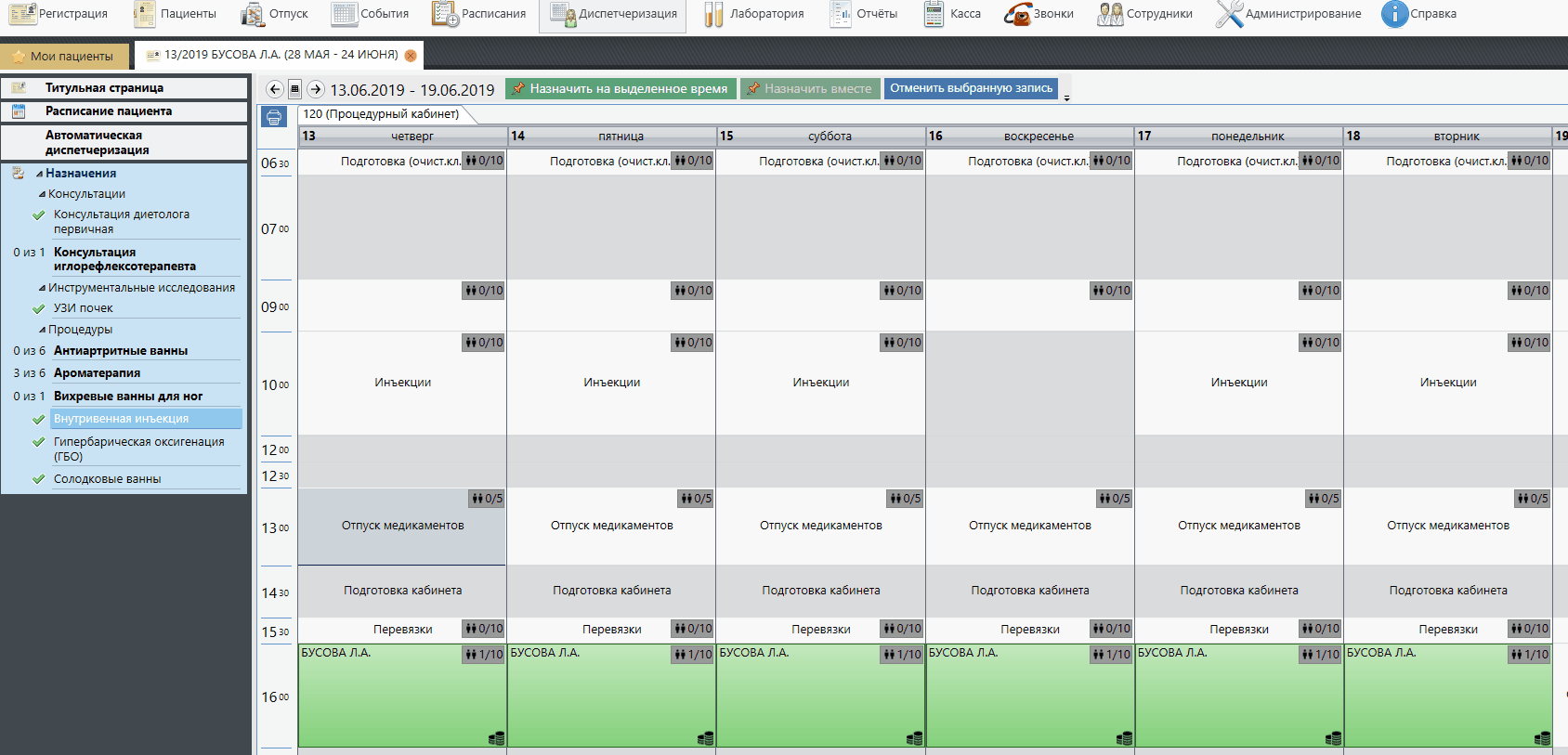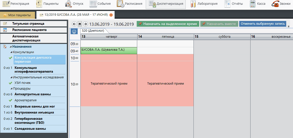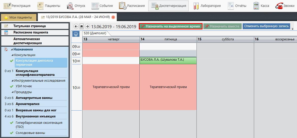 Выбираем необходимое время для процедуры, на которое мы хотим ее перенести → нажимаем кнопку "Назначить на выделенное время" → подтверждаем корректность действий, нажатием на кнопку "Да, изменить время".