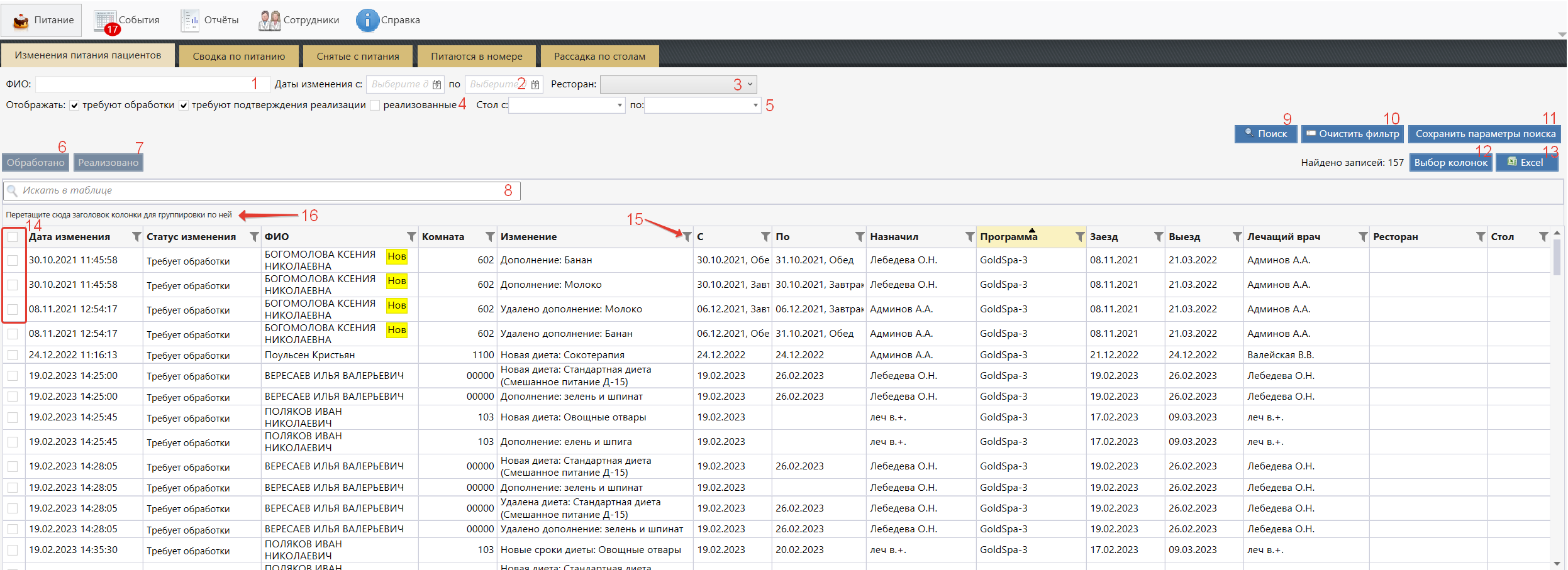 2. По кнопке "Поиск" отобразить пациентов. Стандартно сотрудники для себя оставляют текущую дату в поле С:.. фильтра "Даты изменения" и фильтр "Отображать" "требуют обработки", и "Требуют подтверждения реализации". В случаи если есть несколько мест питания, опционально выбирают своё, по фильтру "Ресторан".