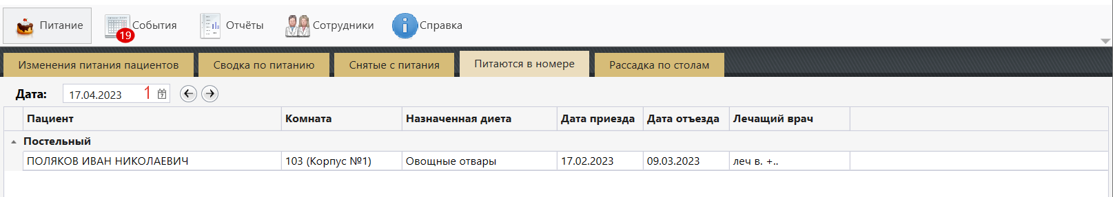 Во вкладке "Питаются в номере" отображаются пациенты, которые не посещают ресторан на выбранную дату. Для таких пациентов выбран постельный режим лечения.