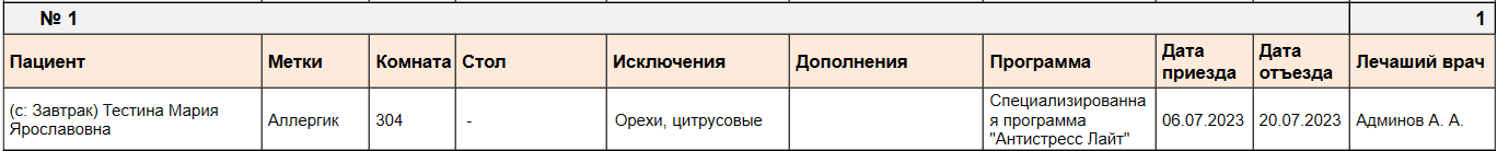Также, если диета действует не весь день, то в колонке "Пациент" будет отображаться информация, с какого приема пищи она действует: