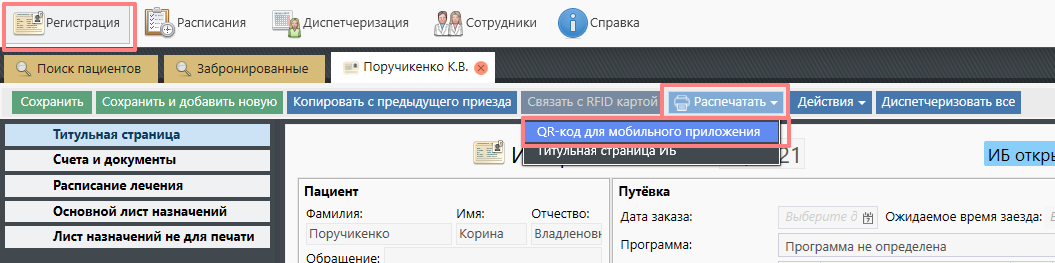 Кнопка "Отвязать мобильное устройство" доступна из модуля "Регистрация" и "Пациенты":