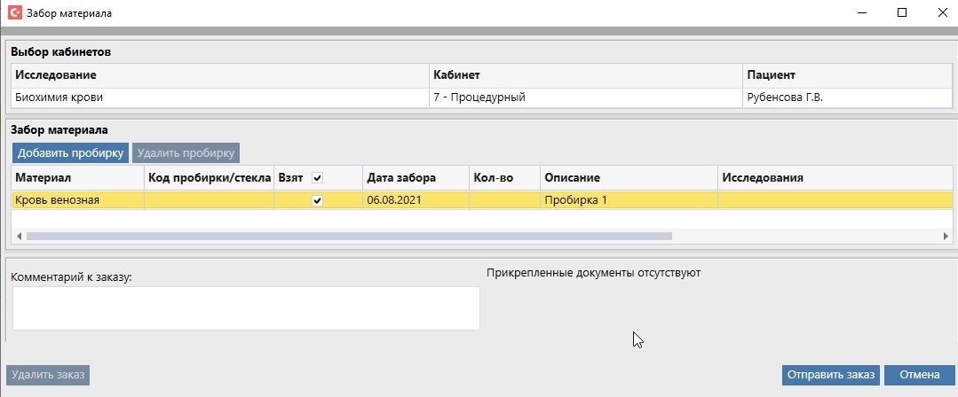 Необязательные биоматериалы при заборе можно выбрать в диалоговом окне: