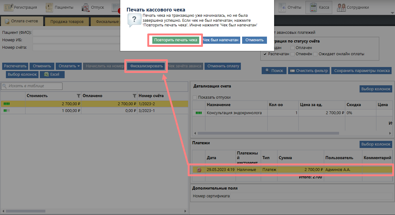 В появившемся окне после нажатия на кнопку "Фискализировать" необходимо нажать кнопку "Повторить печать чека", если чек не был распечатан: