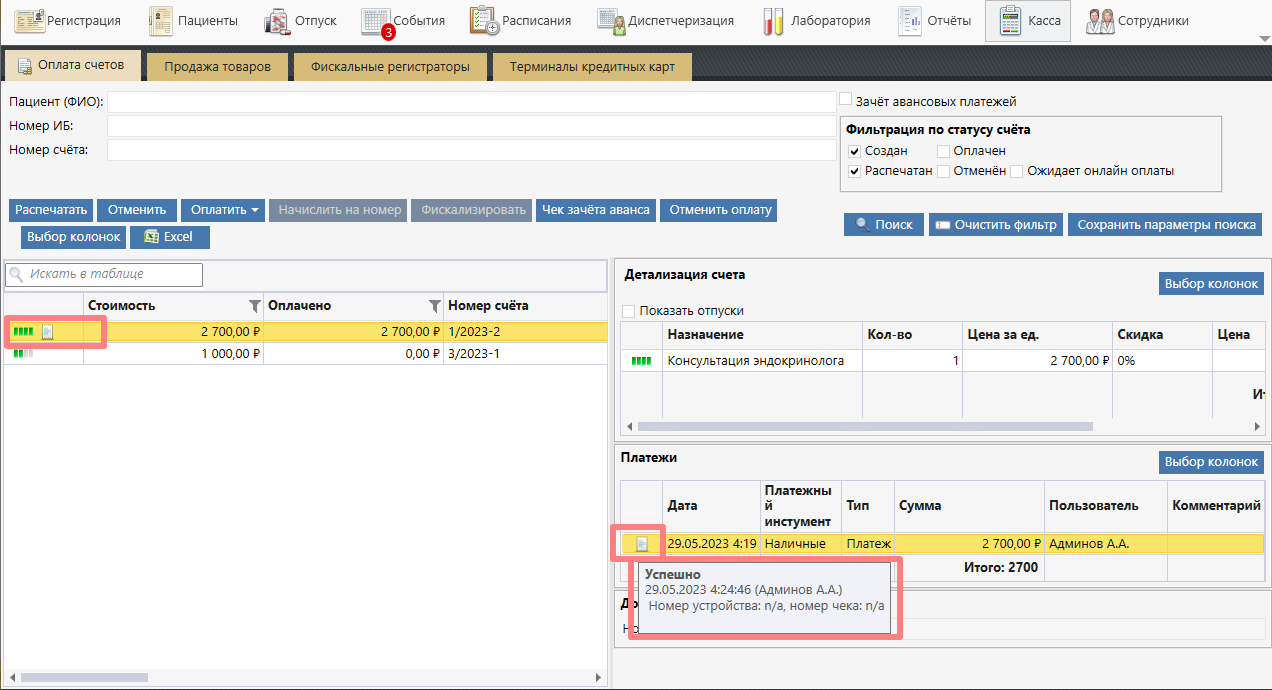 Если у Вас есть счет в системе Санаториум с ошибкой фискализации (при фискализации счета произошла какая-либо ошибка и теперь у Вас на транзакции иконка ошибки фискализации:
