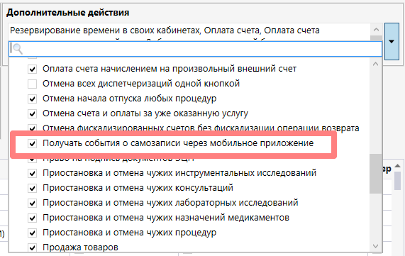 Для специалистов, которые должны получать события о самозаписи пациентов (Лечащий врач или Регистратор, например), необходимо добавить право "Получать события о самозаписи через мобильное приложение".