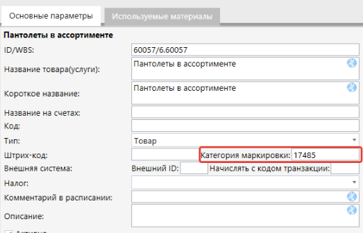 Модуль "Администрирование" → справочник "Товары" → заполнить текстовое поле "Категория маркировки".