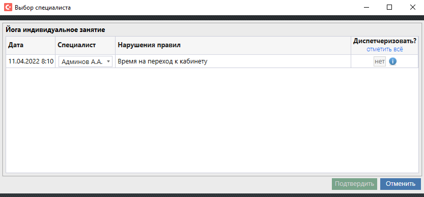 На это время нельзя диспетчеризировать услугу, кнопка "Подтвердить" будет не доступна. Обойти данное ограничение можно, добавив сотруднику право "Игнорирование правила диспетчеризации (кроме несовместимости и вместимости)".