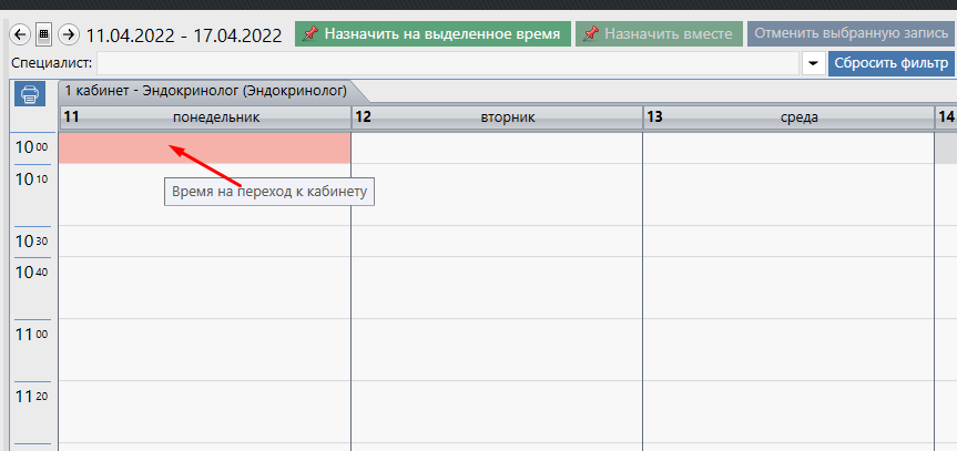 Таким образом, при диспетчеризации второй услуги будет учитываться время перехода, которое окрашивается в красный цвет, при наведении отображается тултип "Время на переход к кабинету".