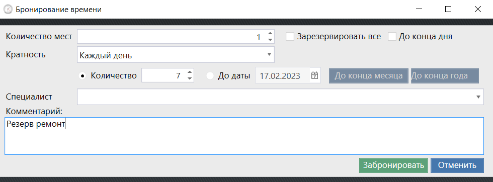Откроется новое окно "Бронирование времени", в котором можно указать: