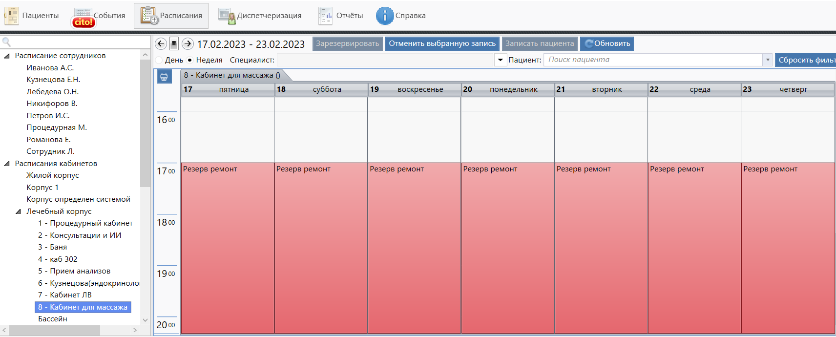 Например: В кабинете "8- Кабинет для массажа" необходимо с 17.00 до 20.00 закрыть кабинет для проведения ремонтных работ на протяжении недели.