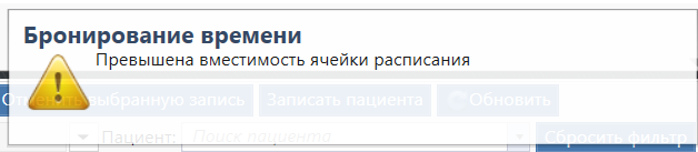 При этом а Расписании кабинета/назначении отображается информация о том, что сотрудника нет на месте. И на это время записать пациентов нельзя (если у сотрудника нет права "Игнорирование правила диспетчеризации (кроме несовместимости и вместимости)").