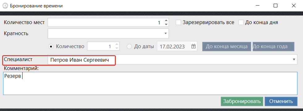 2. Зайти в расписание кабинета/назначения и при резерве указать специалиста.