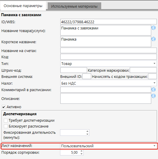 2. Если товар должен выводится не на Основном листе назначений, а на дополнительных, то в настройке товара выбрать необходимый лист назначений: