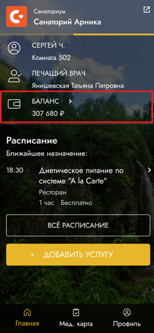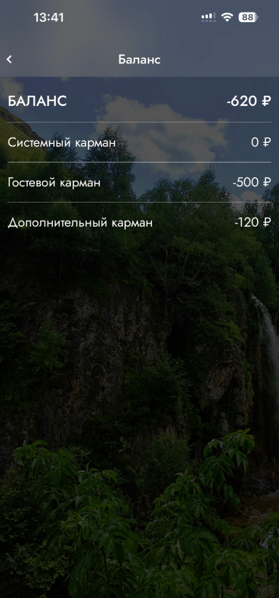 Также реализован вывод баланса определенного кармана, например гость внес депозит на "Медицину" и на "Дополнительные услуги". Для настройки вывода общего баланса и баланса по карманам обратитесь в службу технической поддержки.