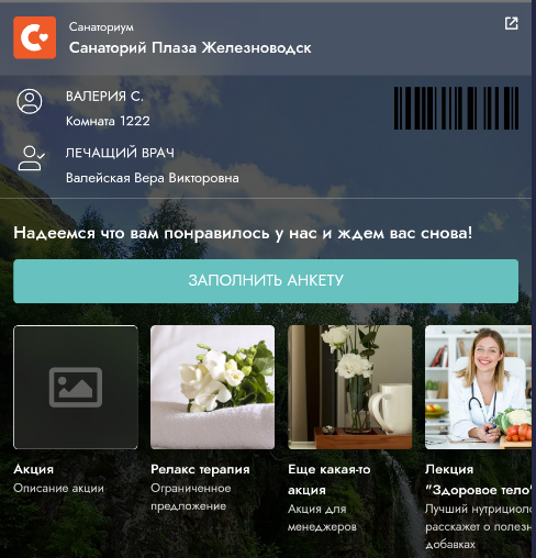 - Вместо кнопок "Добавить услугу" и "Расписание" появляется кнопка "Заполнить анкету"(со ссылкой на веб-страницу с анкетой) и настраиваемый текст (Например: "Надеемся что вам понравилось у нас и ждем вас снова!")