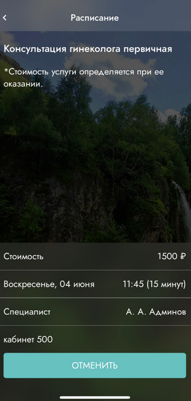 Для просмотра полной информации по назначению кликнете . Далее откроется детализация по выбранной услуге: название назначения, дополнительная информацией, которую необходимо знать перед посещением, будет отображена стоимость услуги, дата и время приема, информация о специалисте если данную услугу проводит определенный специалист и номер кабинета, в котором будет осуществлен приём. После завершения услуги (Если в настройке услуги активен флаг "Публиковать протокол") в детализации самого назначения появится кнопка "Скачать протокол", с помощью которой откроется протокол с дальнейшей возможностью сохранения и отправки.