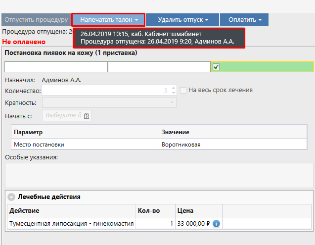 Для печати талона на отпуск необходимо после отпуска процедуры нажать "Напечатать талон" и в выпадающем списке выбрать нужный шаблон.