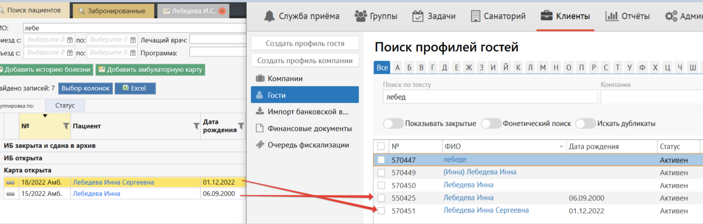 3. Профиля сольются в один, при этом все начисления также перенесутся. Таким образом в Санаториуме и в Логусе останется одна амб.карта и один профиль.