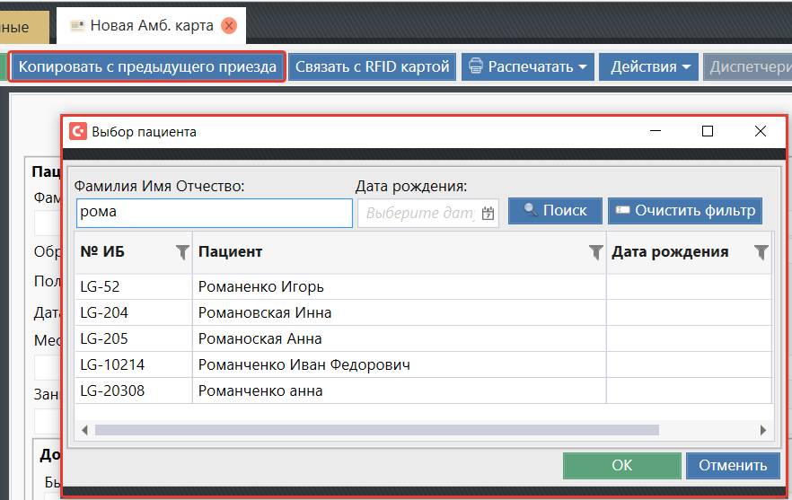 - В окне "Выбор пациента" выбираем нужную ИБ.