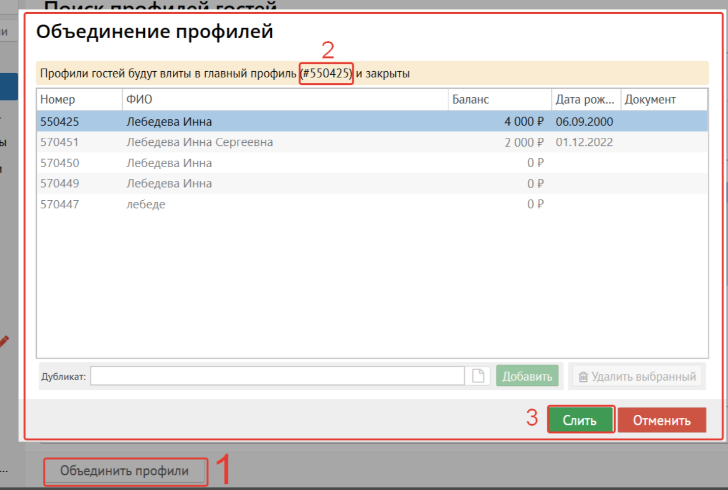 Для этого используйте фильтр по ФИО и первым выберите именно этот профиль, потом все остальные - нажимаете на кнопку "Объединить". Откроется новое окно, в нем еще раз обратите внимание на номер Главного профиля (2) и нажимаете "Слить" (3).