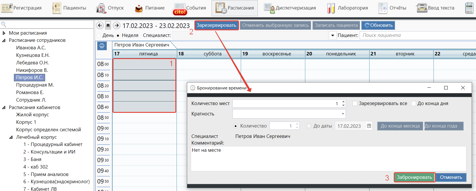 5. Готово! В расписании кабинета/назначении отображается информация о том, что сотрудника нет на месте. И на это время записать пациентов нельзя.