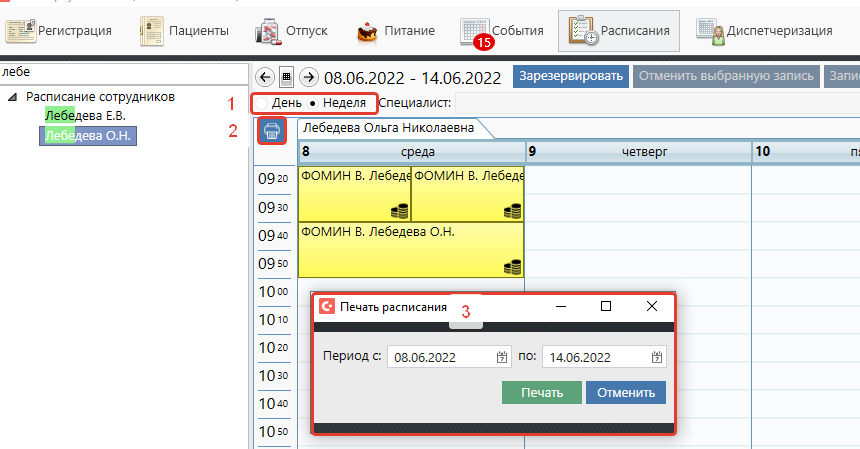 1. Для поиска пациента, которому назначена и диспетчеризована (назначено время приема) услуга следует пройти в модуль «Расписания» (1).