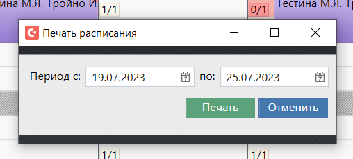 3. Нажать на кнопку "Печать расписания", откроется новое окно, в котором можно изменить период печати;